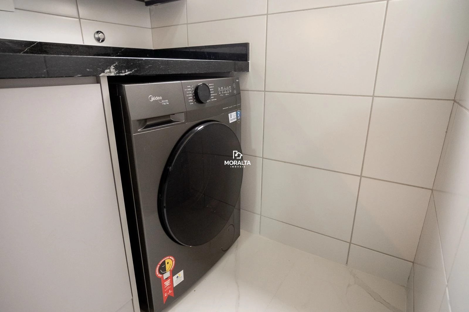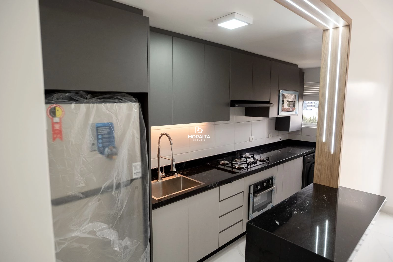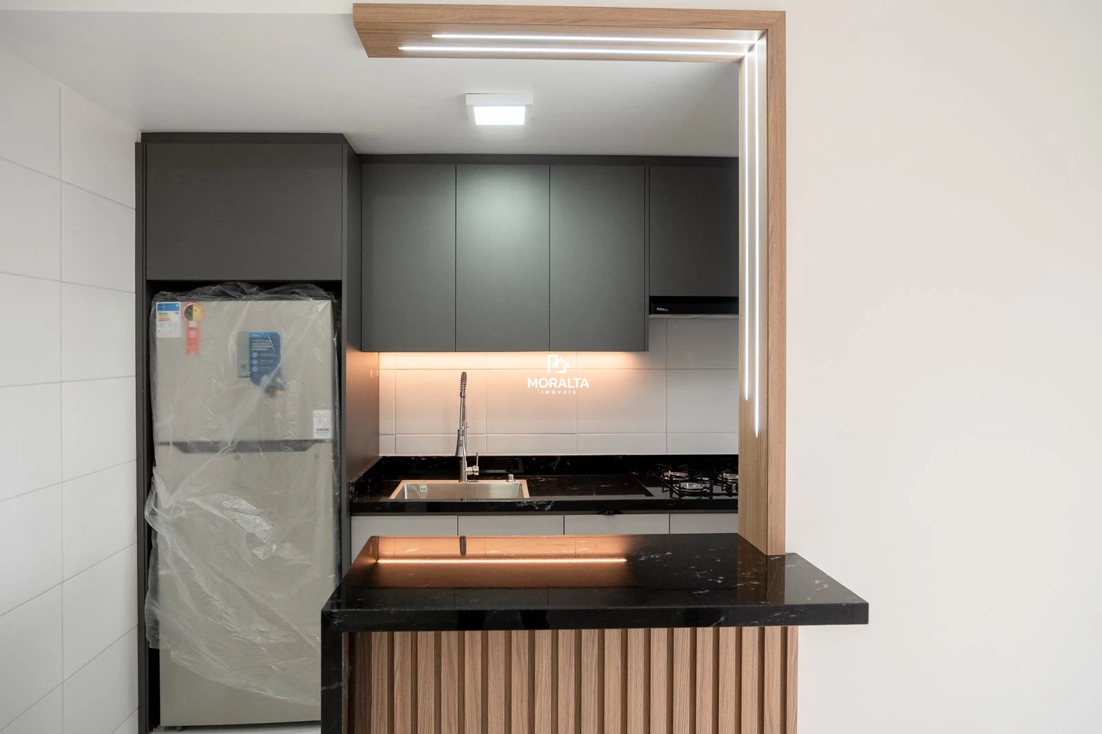 Acabamentos de alto padrão: porcelanato na cozinha e piso laminado premium nos demais ambientes