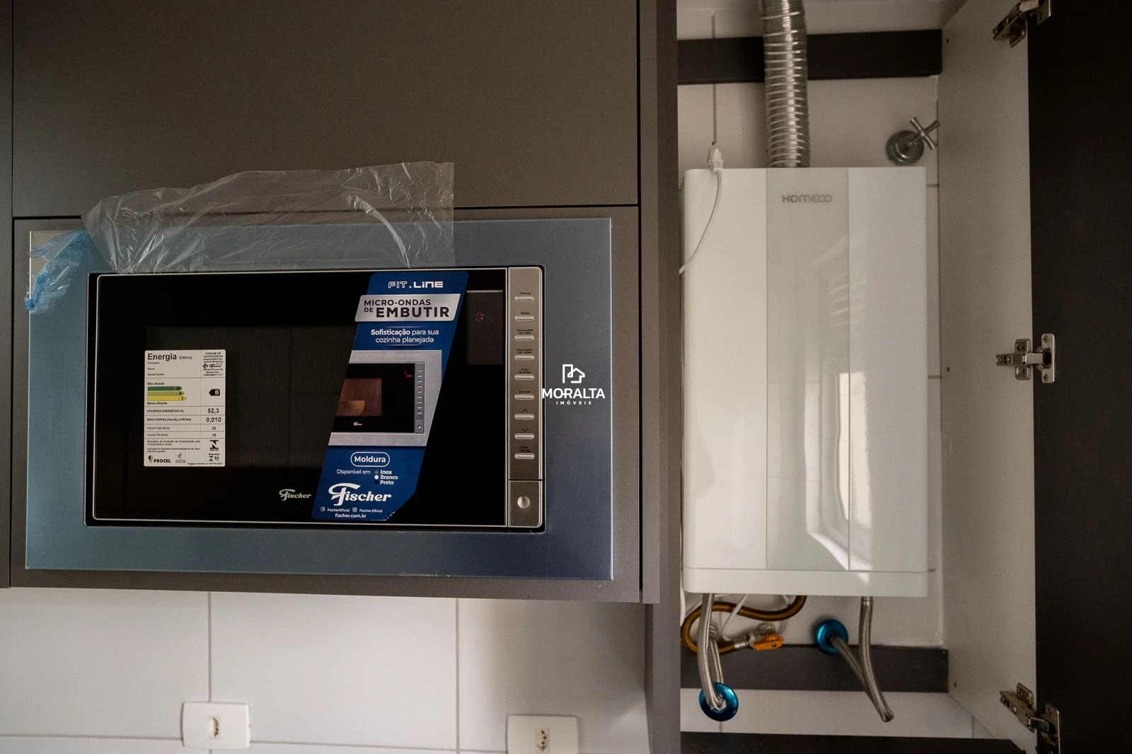 Cozinha planejada completa com fogão, forno, micro-ondas, depurador e geladeira nova, todos com garantia de fábrica