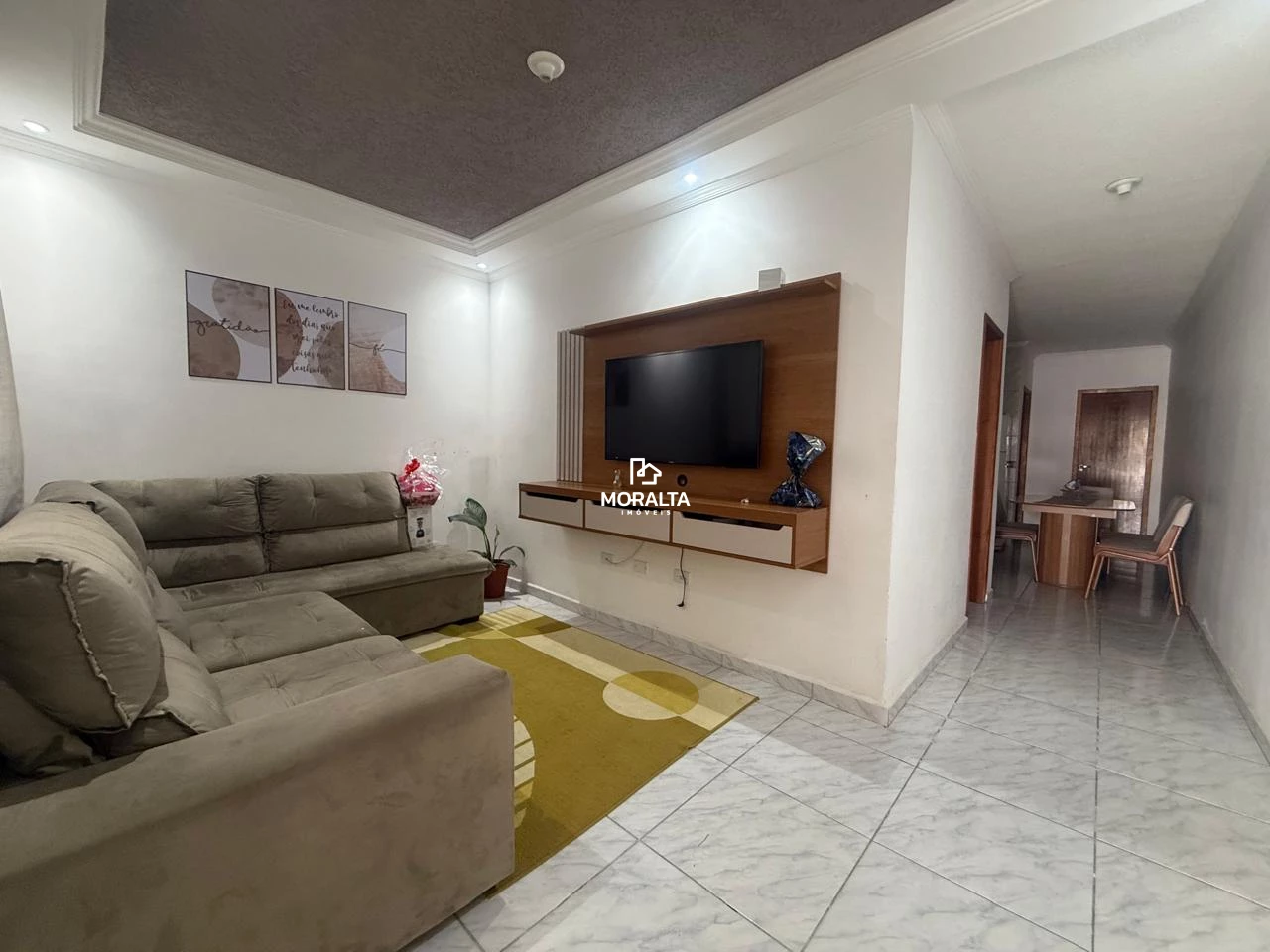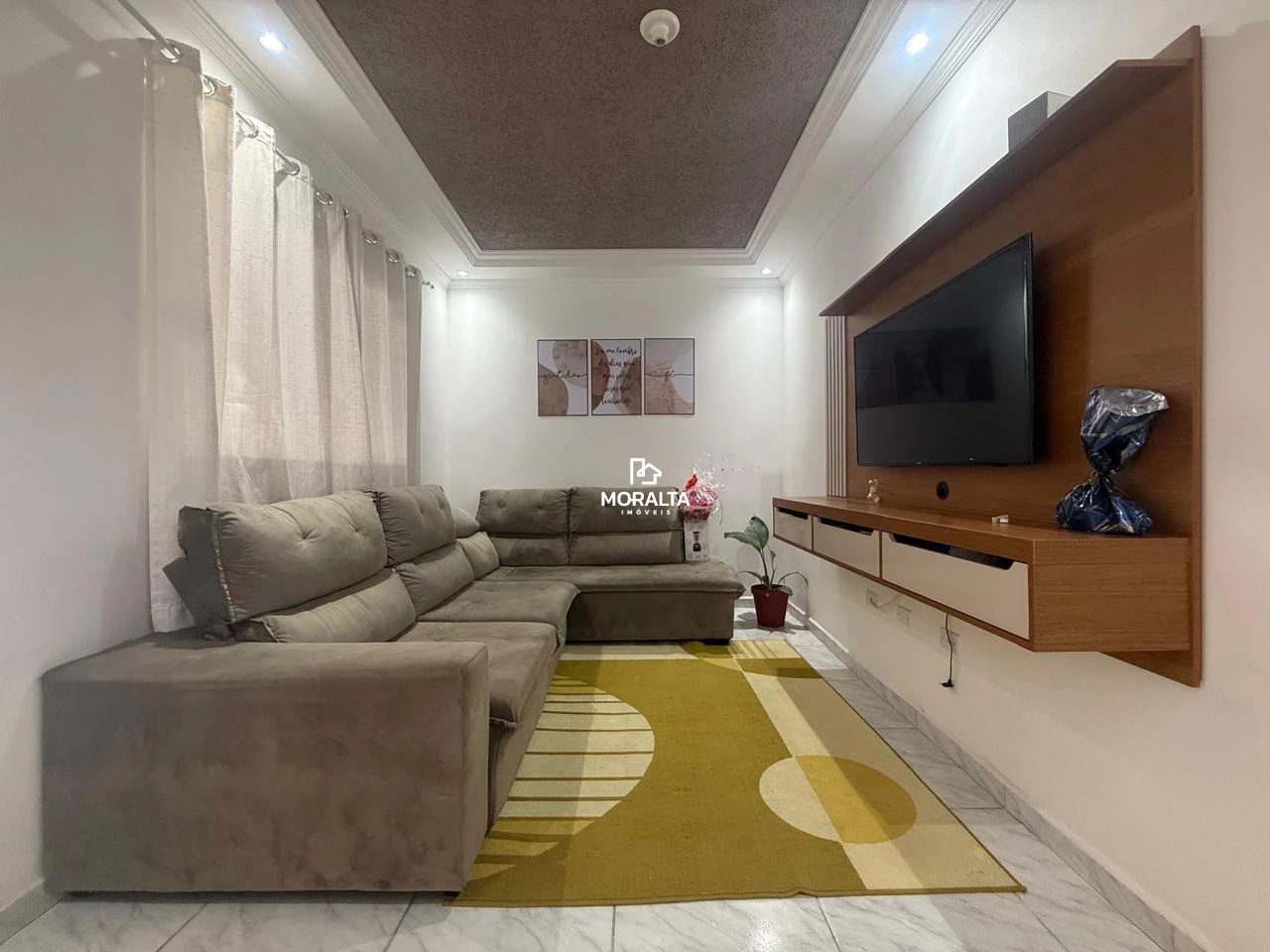 Sala com teto rebaixado em gesso, proporcionando um toque moderno e aconchegante