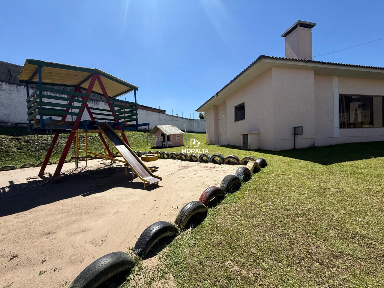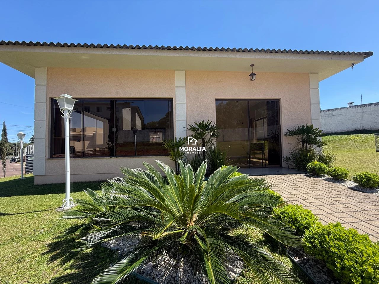Jardim frontal e jardim nos fundos, com espaço para churrasqueira