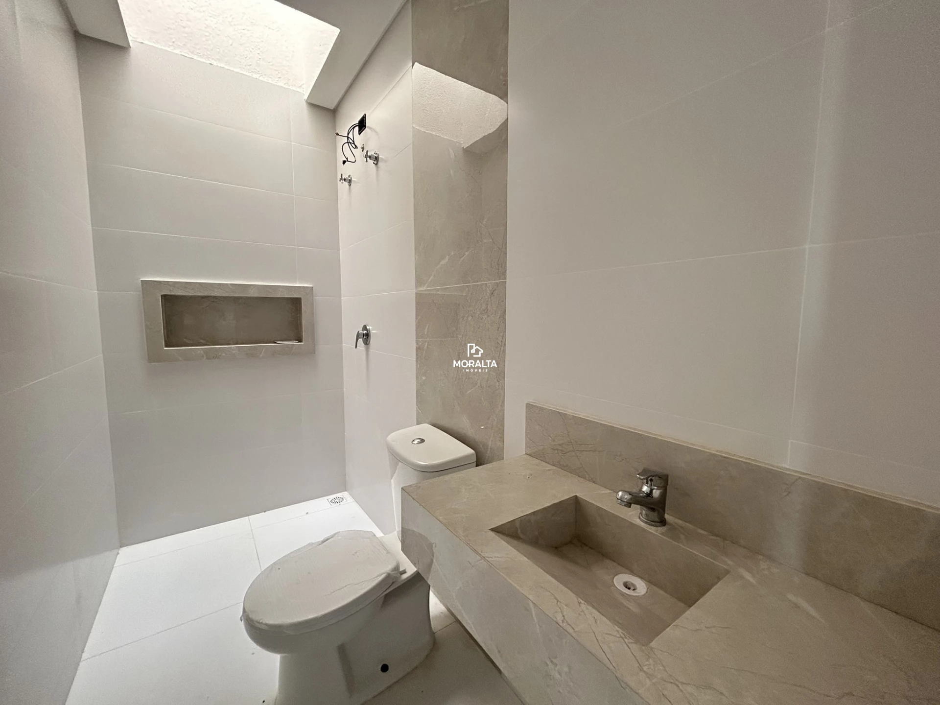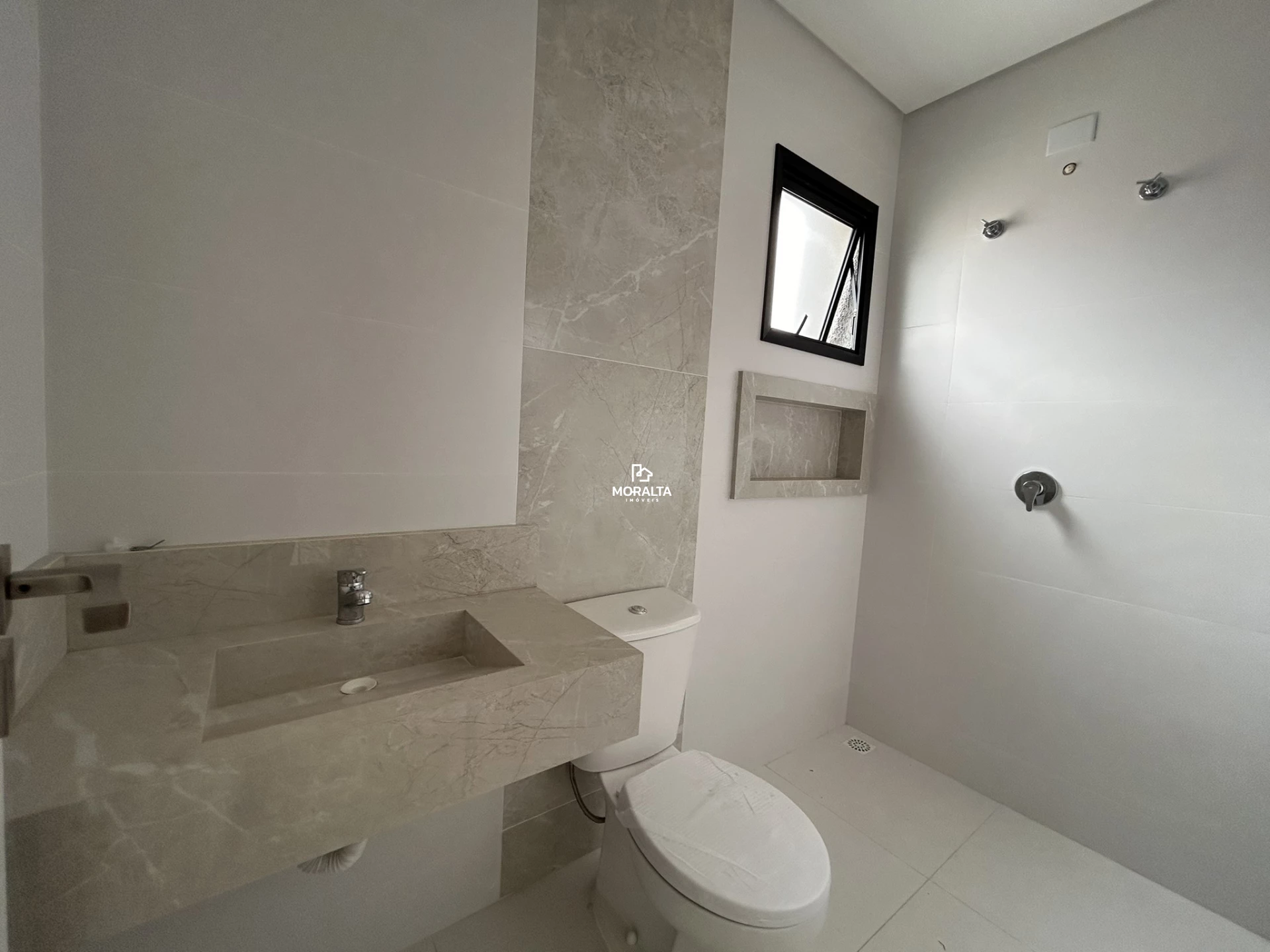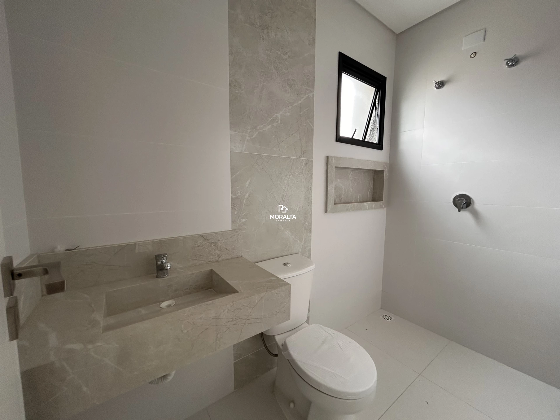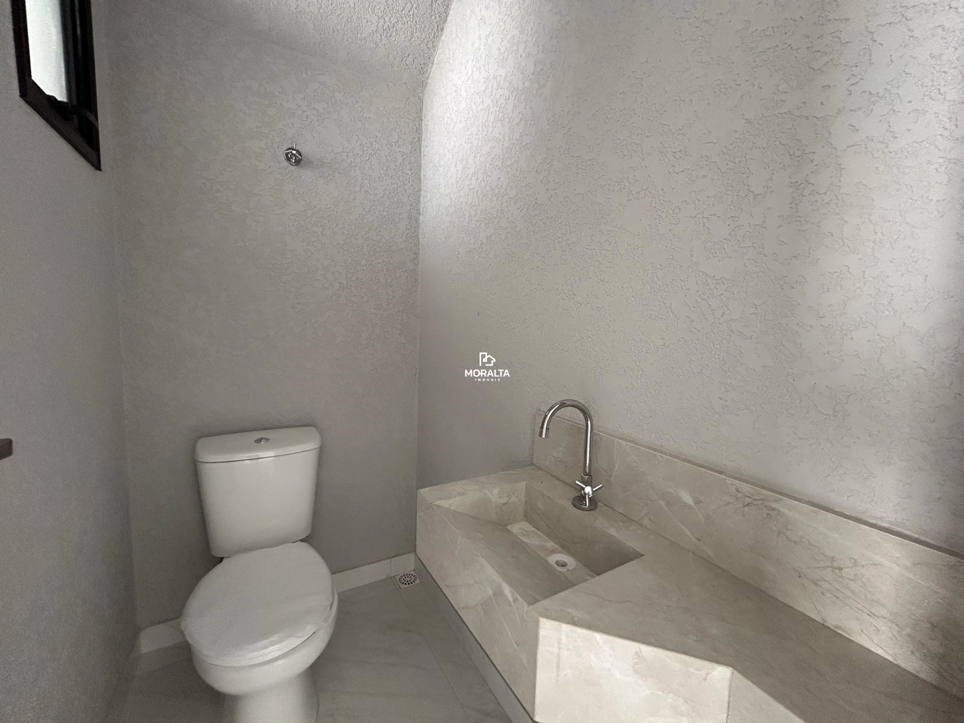 - Banheiro social com piso em porcelanato.